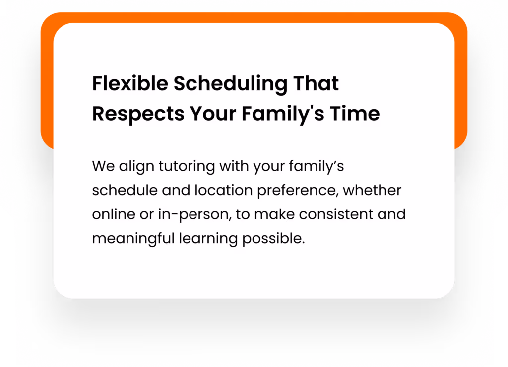 We align tutoring with your family’s schedule and location peference, whether online or in-person, to make consistent and meaningful learning possible.